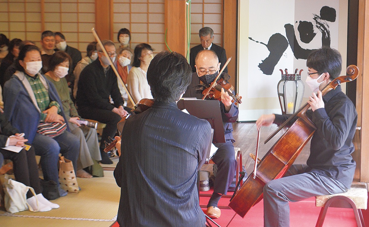鎌倉交響楽団でコンサートマスターを務める五味俊哉さん(54)らによる弦楽三重奏「ミハラシンフォニカ」が4月23日、円覚寺で室内演奏会を開いた。