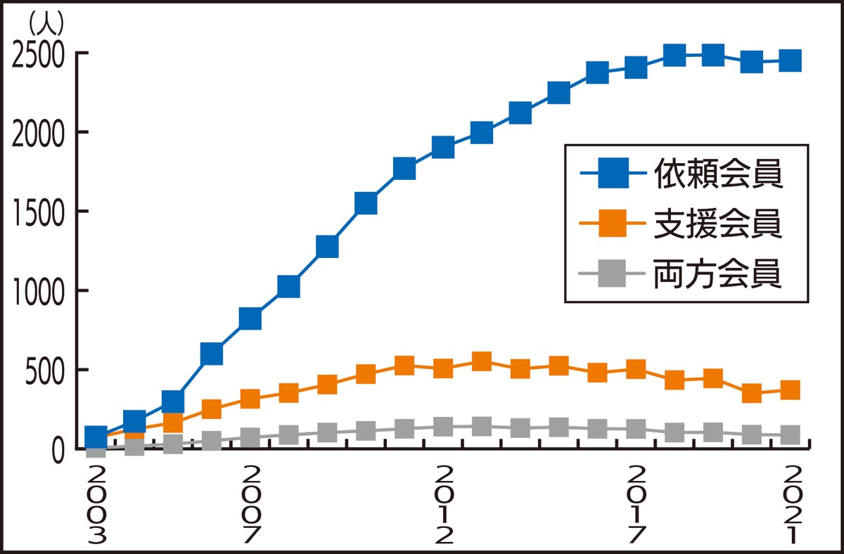 子育て中で家事や送迎などの助けを必要とする人と、有償ボランティア(1時間700円〜)で支援者とをつなぐ事業が鎌倉市で始まり20年―。事業を担う鎌倉市ファミリーサポートセンター(通称ファミサポ)によれば、20年間で子育てに関わる環境が変化し、支援を必要とする「依頼会員」は10倍に。一方、サポートする「支援会員」は2・5倍に留まり、不足している状態だ=表。