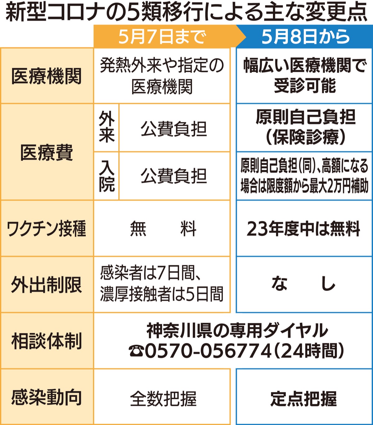 新型コロナはこれまで2類相当に位置付けられ、政府主導により外出自粛の要請や入院勧告などの特別措置が講じられてきた。今回の5類移行に伴い、感染症対策は行政が要請・関与していく仕組みから、個人や事業者の自主的な判断に転換する。