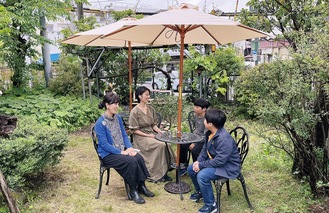 パーチェガーデンは、江ノ電踏切横の門から入れる園庭。「パーチェ」はイタリア語で平和を意味し、日除けのパラソルに机と椅子が設置され、来園者は自由に腰を下ろして休むことができる。