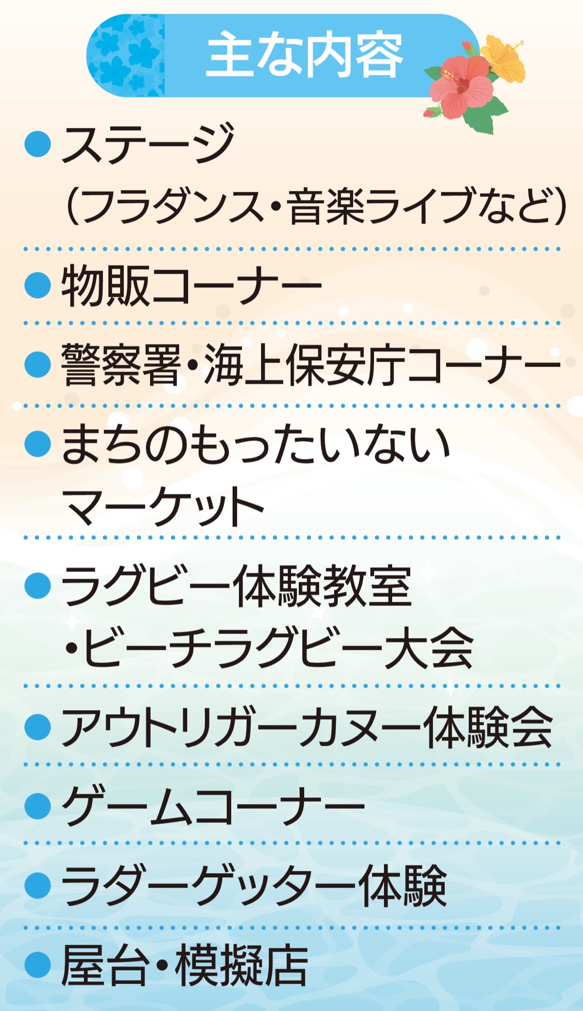 会場ではステージ以外にも、物販、地域通貨「クルッポ」を活用したまちのもったいないマーケット、ビーチラグビー大会、アウトリガーカヌー体験会などを実施。子ども向けのゲームコーナーや夏のアイテム作り、ボールを使ったニュースポーツのラダーゲッター体験も企画されている。