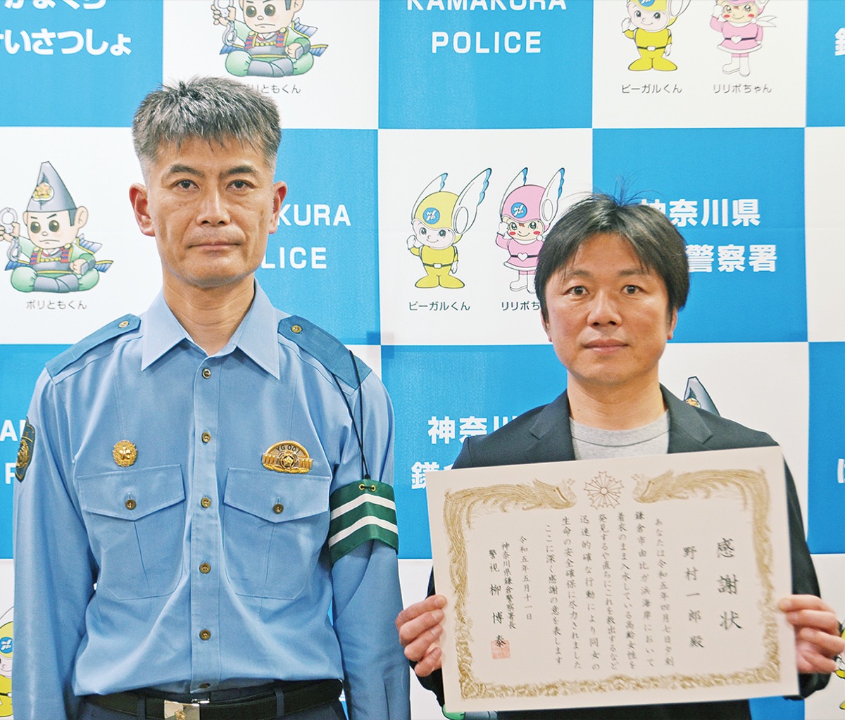 鎌倉警察署は5月11日、高齢女性の人命救助にあたった横浜市在住の野村一郎さん(49)に感謝状を贈呈した。