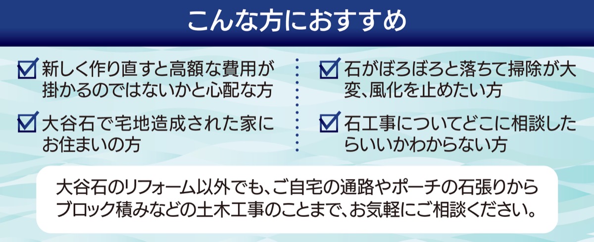 一方で塀や石垣全体を取り換えるには多額の費用が必要で、古い大谷石自体を処分するだけでも大きな出費を伴うのが実情だ。”大谷石取り扱いのプロ”の石半には「塀・石垣がいつか崩れたり倒れたりしないだろうか」「昔の施工で地震が心配」「風化を止めたい」と相談が数多く寄せられている。