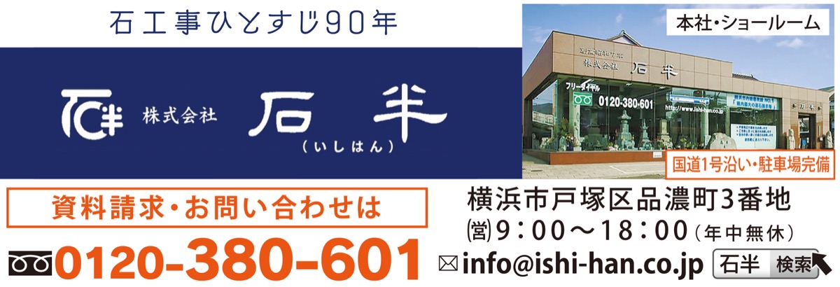 昭和7年に創業した石半は、横浜の帆船日本丸の「行幸啓記念碑」などの行政案件を数多く手掛けることで知られる。石工事ひとすじ90年の歴史があり、確かな実績による信頼の石材店として認知されている。