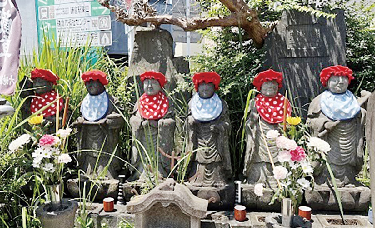 イベントには、6つの商店会と1つの団体が参加し、由比ガ浜の海をイメージした青色のみずたまのれんやフラッグを掲出する。さらに協力店舗などでは、湘南ゆかりのアーティストの作品を展示したり、コラボ商品を販売したり。六地蔵までもが特別仕様=写真=となり、街中をみずたまが涼しげに彩り、盛り上げている。