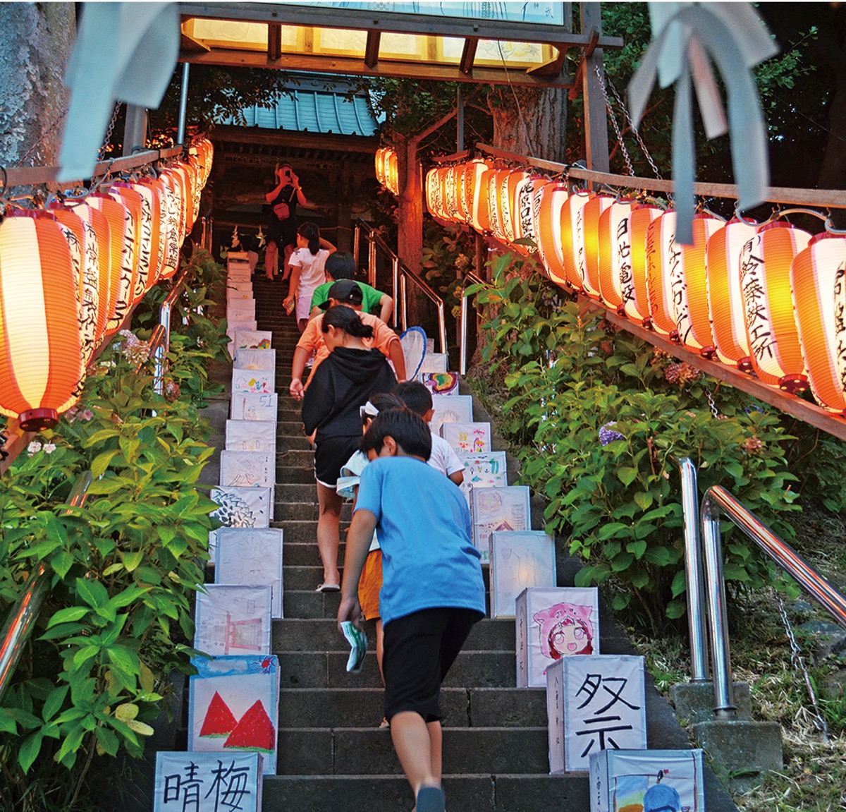 境内の石段には、地元子ども会が作った56基の灯ろうが並び、19時頃に灯火。訪れた人たちは、花火やスイカ、海水浴のシーンなどが描かれた灯ろうを眺めながら、夏の訪れを感じていた=写真。