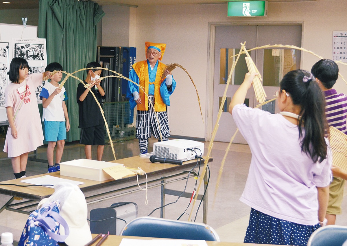 仙助流の芸人「よしやるぞう」さんが登場し、子どもたちは手拍子をしながら、竹製のすだれの形を次々と変化させる技を鑑賞した。この芸が富山県で生まれ、商売の客寄せのために演じられ広まった歴史などを学んだ後は、体験の時間に。