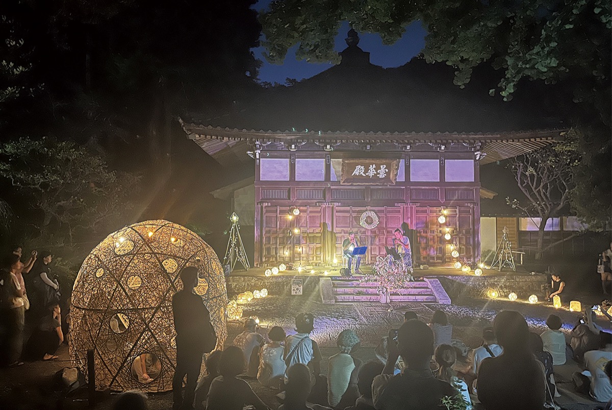 日没後には、竹オブジェがライトアップされ、本堂一帯が幻想的な光景に包まれた=写真。また伐採竹で作ったオカリナによるライブも披露され、60代男性は「美しい音色と光景で、日常では味わえない雰囲気」とイベントを楽しんだ。