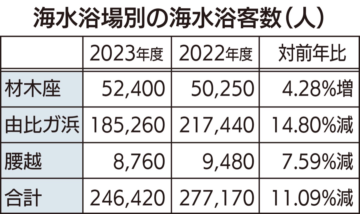 鎌倉市は9月15日、材木座、由比ガ浜、腰越の市内海水浴場における2023年度の来場者数が、過去最少の約24万6千人だったと発表した。