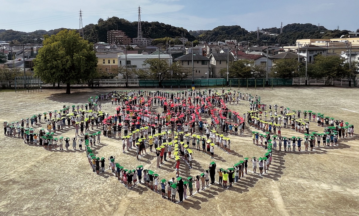 約750人の児童と教職員たちが赤、緑、黄色の3色の画用紙で描いたのは同校の校章。撮影する飛行機が校庭に近づくと、画用紙を頭上に掲げ、節目を写真に記録した。