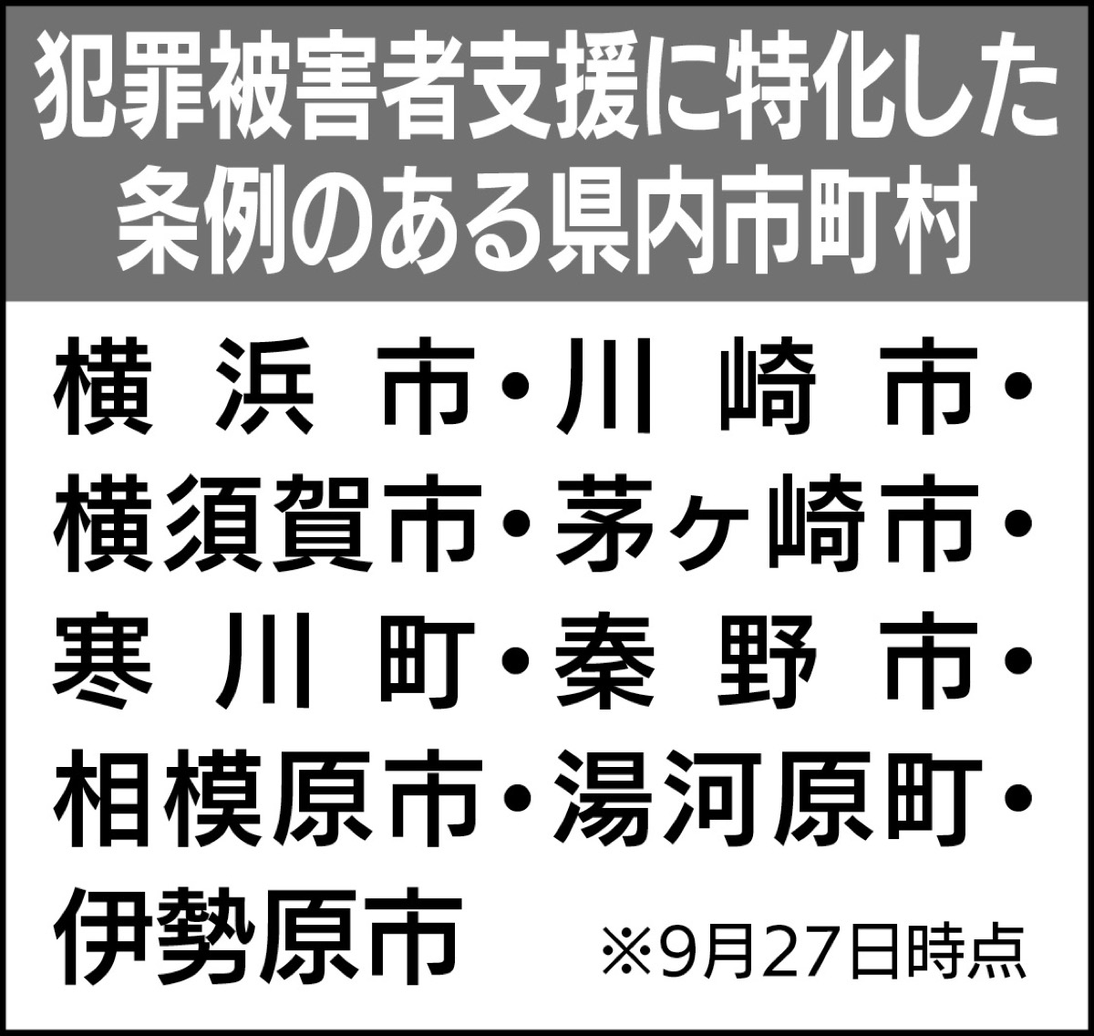 日本では、04年に犯罪被害者等基本法が制定。鎌倉で防犯に取り組んでいた大津代表は、神奈川県にも支援拡大を提案し、09年に神奈川県犯罪被害者等支援条例が施行された。それにより、被害者や家族が相談したり、カウンセリングを受けたりできる「神奈川被害者支援センター」(横浜市神奈川区)が設置された。