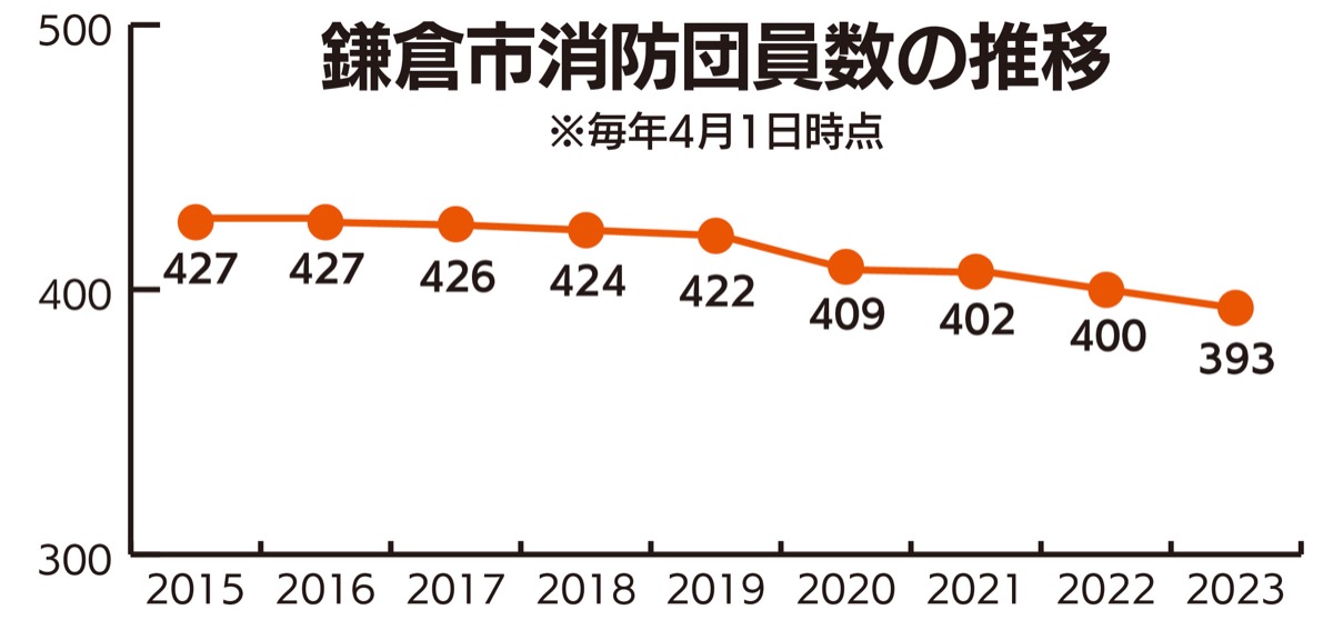 普段は仕事や学業、家事などをしている一般市民が、災害発生時には消防車両に飛び乗って現場に急行し、消火活動。地域を守る一役が消防団員だ。鎌倉市消防団には、2023年10月時点で402人の団員が所属し、災害現場での活動や台風襲来時の見回り、イベントでの警備などに携わる。11月の秋季火災予防運動を前に、市消防団の現状について調査した。