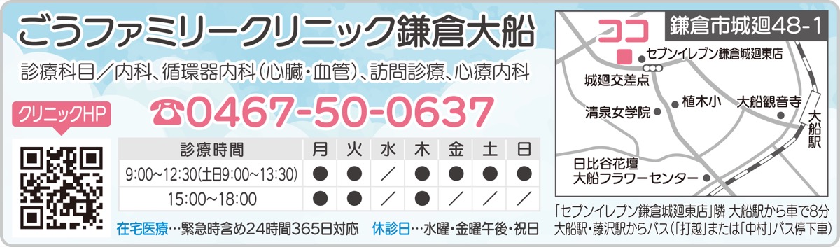 「メディカルモール鎌倉城めぐり」(城廻48の1)の一角で、かまくら脳神経外科(MRI完備)とともに、今年10月に開院したのが「ごうファミリークリニック鎌倉大船」。大船西地域の数少ないクリニックとして、内科・循環器内科・心療内科・在宅診療を展開している。
