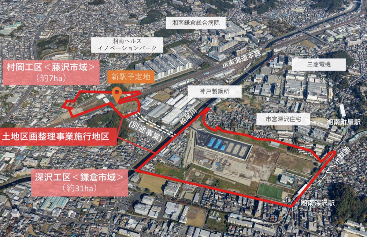 都市再生機構(UR)が施行する土地区画整理事業の対象は、藤沢市の村岡工区(約7ヘクタール)、鎌倉市の深沢工区(約31ヘクタール)の計約38ヘクタール。新駅設置と連携した村岡は、最先端のヘルスケア産業が集積するイノベーション拠点により、新たな都市形成を図る。