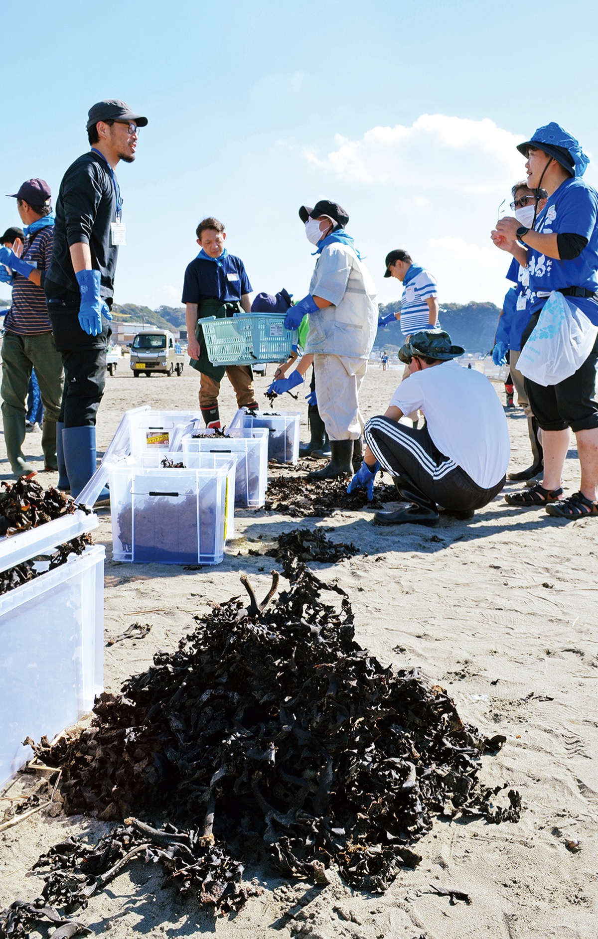 この日は、海藻が普段の1割程度と少なかったが、初めての参加者は珍しそうに、活動関係者は手慣れた様子で砂浜に流れ着いた海藻を海水で洗い、次々とケースに収めていった。