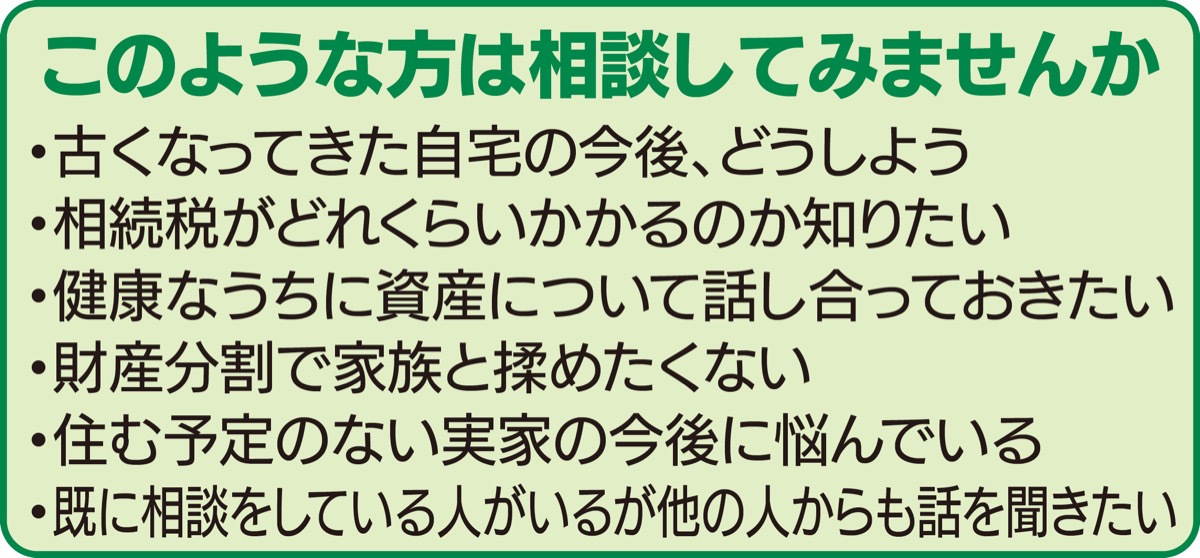 超高齢化社会の日本において、相続は早めの対策が重要。しかし「子供たちへ資産を上手に遺したい」「空き家の対処、どうしよう…」「不動産の管理を子供に任せたい」「老朽化してきた自宅、このままで引き継いでいいものか…」など相続の問題は多岐に渡り、誰に相談したらよいのか分からない人も多いのではないだろうか。