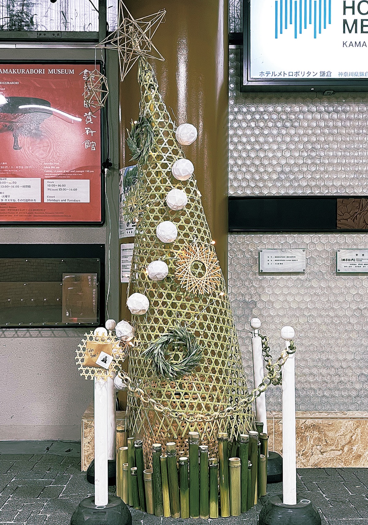 製作したのは、「地域の竹を宝にかえる」をモットーに活動する鎌倉竹部。鎌倉市内の竹林整備で得た間伐材を用いて、「土に還るサステナブルなクリスマスツリー」に仕立てている。鎌倉竹部のツリーが駅構内に展示されるのは今年が初めて。12月25日(月)まで設置。
