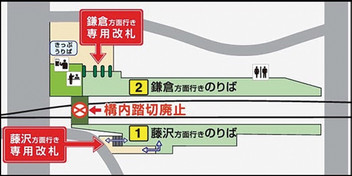 江ノ島電鉄は、長谷駅構内で鎌倉方面と藤沢方面ホームを行き来する構内踏切を2月17日始発から廃止する=図。新たに導入する信号システムへの移行に伴うもので、同3日からは江ノ島駅(藤沢市)の構内踏切も廃止する。