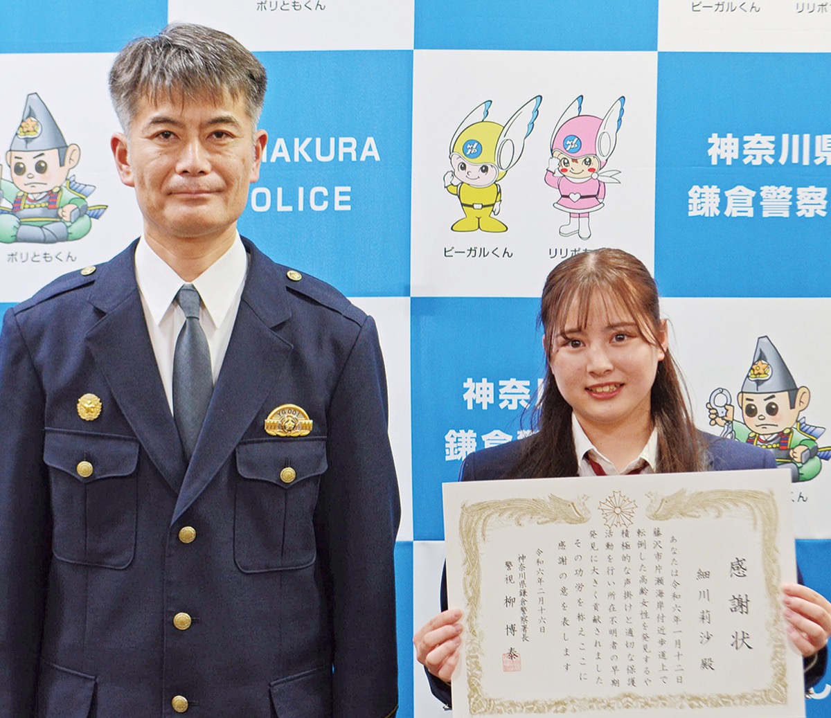 鎌倉警察署は2月16日、行方不明になっていた80代女性の保護に貢献したとして、平塚市在住の細川莉沙さん(平塚学園高校3年)に感謝状を贈呈した=写真。