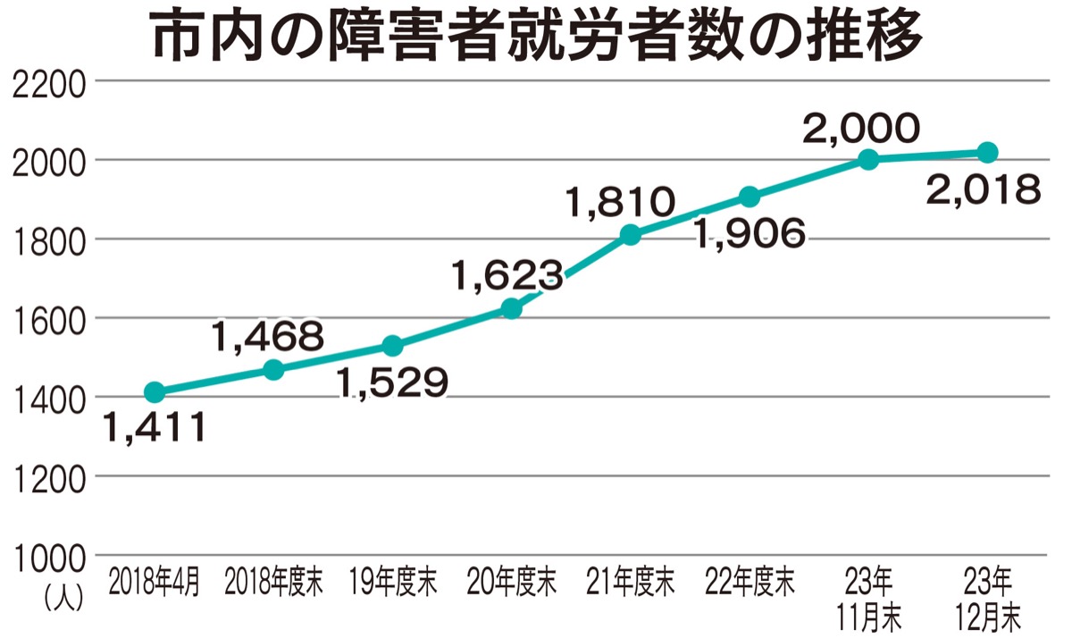 市は事業開始の1年前、アンケートも活用して市内の就労状況を調査。当時、障害者手帳所持者のうち18歳以上65歳未満の人は2696人。その時点での就労者に加え、未就労者1451人が可能な限り社会で活躍できるよう、雇用2000人を目標に据えた。