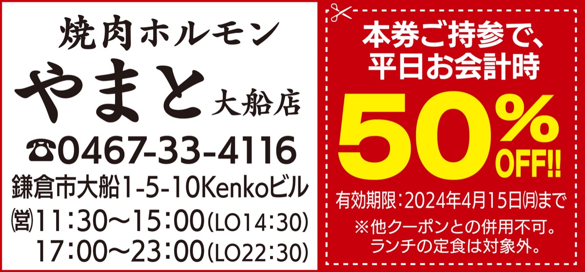 同店では、本紙読者に「『平日50%オフ!』クーポン」をご用意。下記クーポン持参でお会計時に割引が適用される。月〜木曜日の「ハッピーアワー」でもクーポン併用可なので、お得にぜいたくな時間が堪能できそうだ。有効期限は4月15日(月)まで。