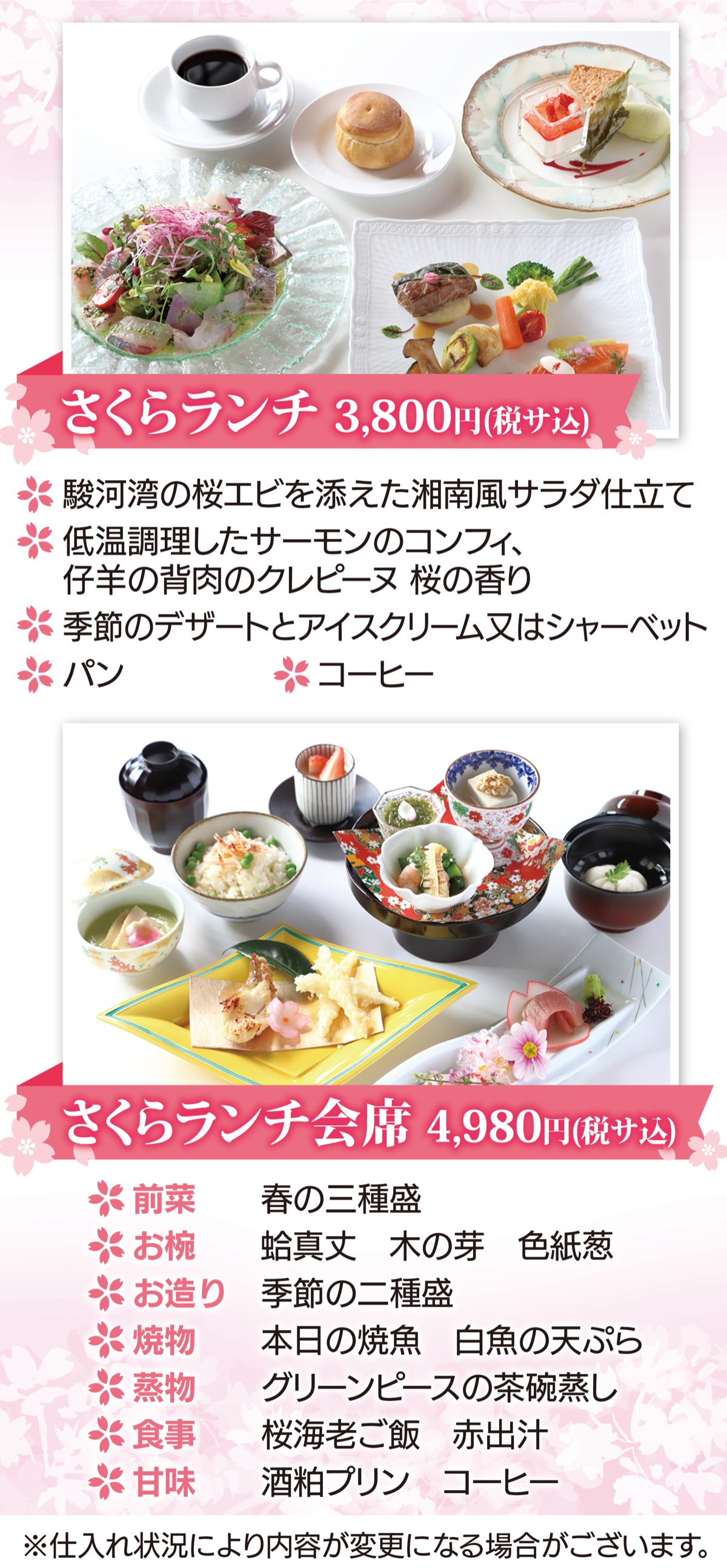 フレンチレストラン「ペルゴーラ」では、「さくらランチ」(3800円)を提供。同店不動の人気を誇る「湘南風サラダ」に、駿河湾の桜エビをプラス。メインは、低温調理したサーモンのコンフィと、桜香る仔羊の背肉のクレピーヌを一皿で。本日のスープの追加(プラス700円)、牛肉への変更(プラス1100円)も可能。パン・コーヒー付きで、季節のデザートまで楽しめるコースになっている。