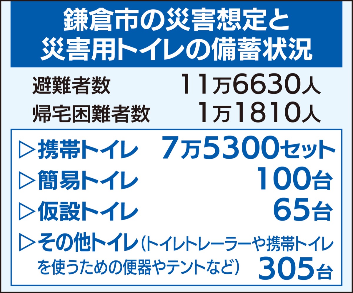 鎌倉市では、相模トラフ沿い最大クラスの地震の避難者を11万6630人、帰宅困難者を1万1810人と想定(2015年県算出)し、災害時のトイレについても備えを進めている。