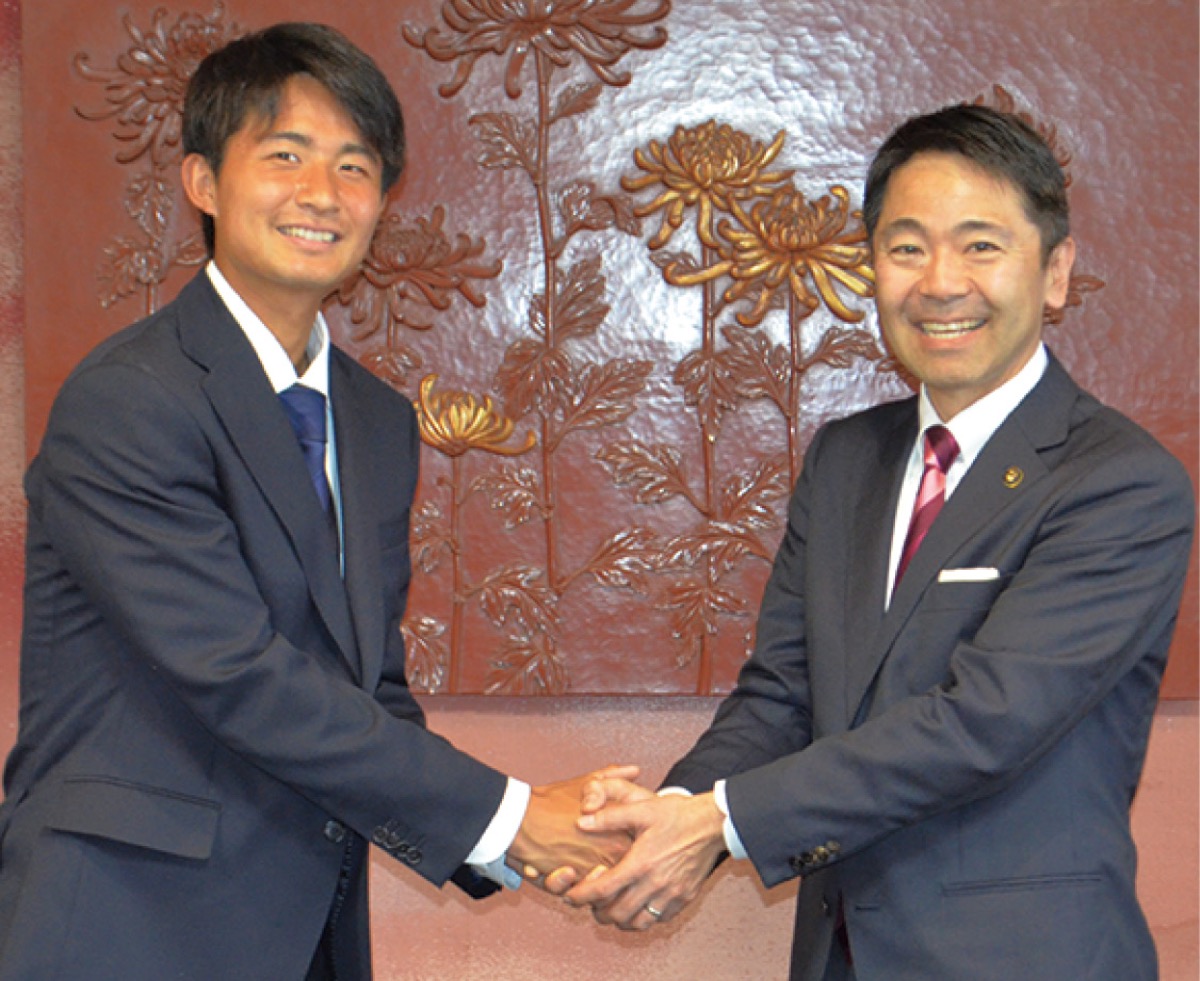 また松岡選手は、4月8日に松尾崇市長を訪問。松尾市長は、「目標に『鎌倉』が入っているのがうれしい」と喜び、活躍を期待する。