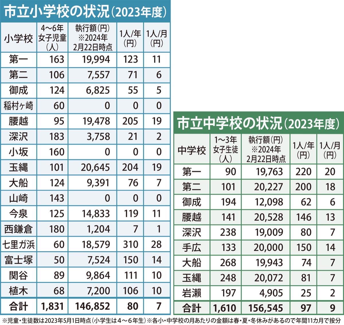 昨年度は鎌倉市の小学校16校、中学校9校に各校2万円ずつの生理用品代が予算化されました。結果は下の表で、何も使っていない小学校が3校もありました。