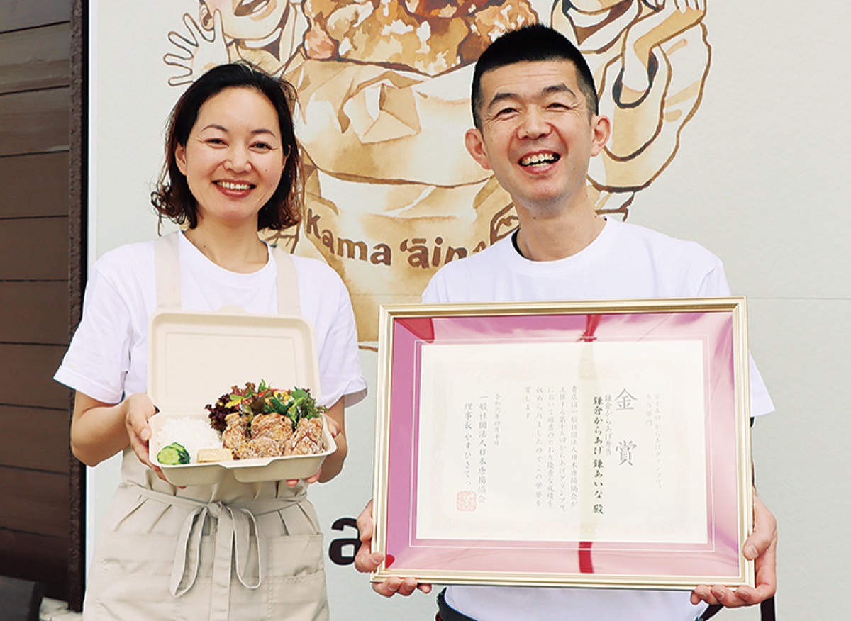 からあげグランプリは、(一社)日本唐揚協会が主催。今回の弁当部門には全国から40店舗が参加し、鎌あいなを含む12店が金賞に輝いた。同店が出品したのは、醬油ベースの唐揚げに、食堂時代から人気の卵焼き、地元農家から仕入れる鎌倉野菜が彩を加える「鎌倉からあげ弁当」(980円)。幅広い年代が食べやすいよう、スパイスは使用していない。