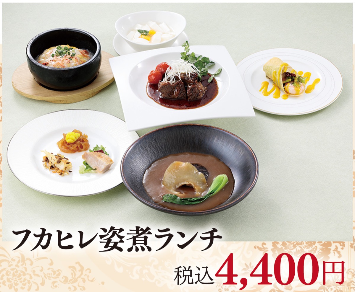 ランチではフカヒレ姿煮のコースも限定20食販売(税込4400円)。豚骨、丸鶏、鳥足などを長時間煮込んだ濃厚ながら後味すっきりなスープが人気を博している。