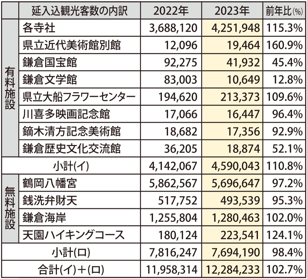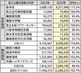 鎌倉文学館の休館や大河ドラマ関連の観光客が落ち着き、一部寺社・施設で減少はしたものの、昨年5月8日に新型コロナが5類に移行した影響もあり、総数は昨年を上回ったと市は分析する。