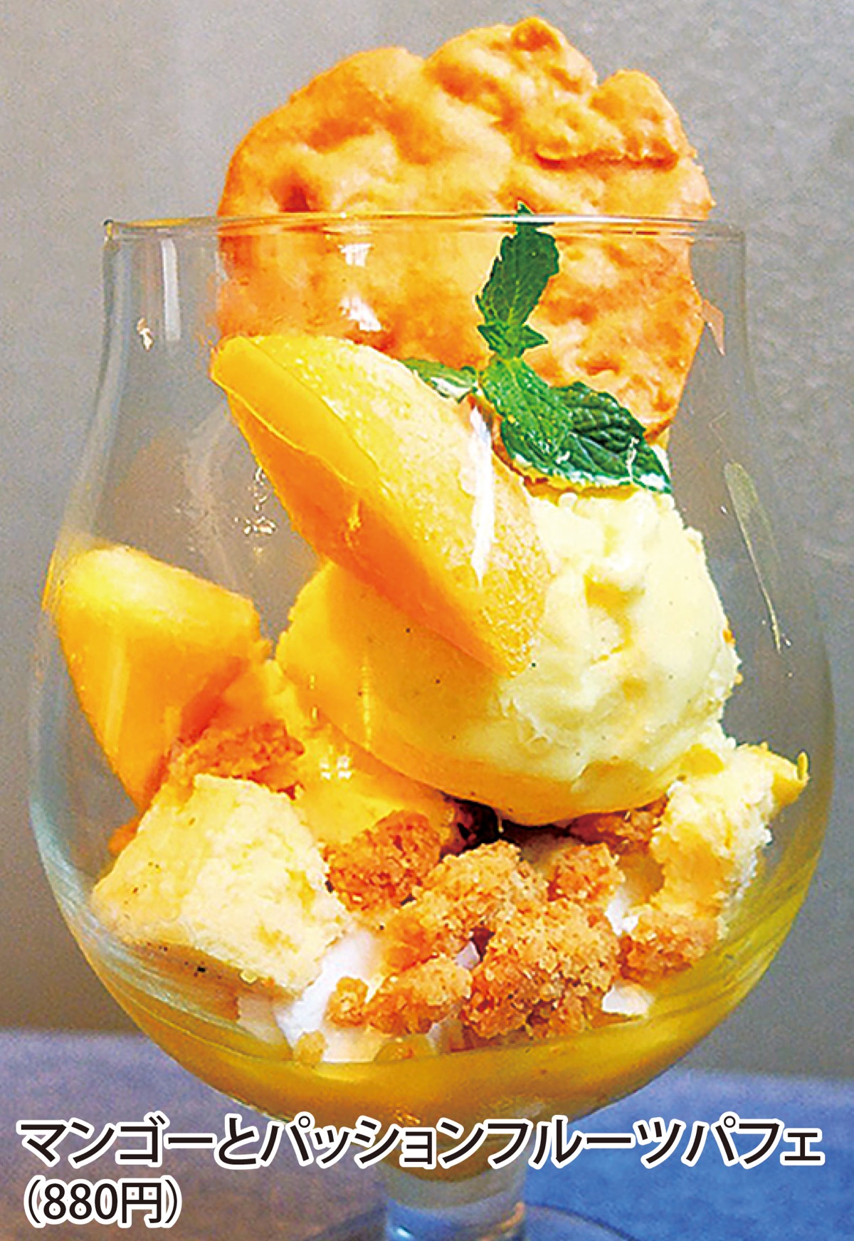 季節限定「マンゴーとパッションフルーツパフェ」は、マンゴープリンにチーズケーキ、フローズンヨーグルトなど暑さを忘れるひんやりスイーツてんこ盛り。最初の一口から最後の一口まで美味しさが続く工夫が見事。