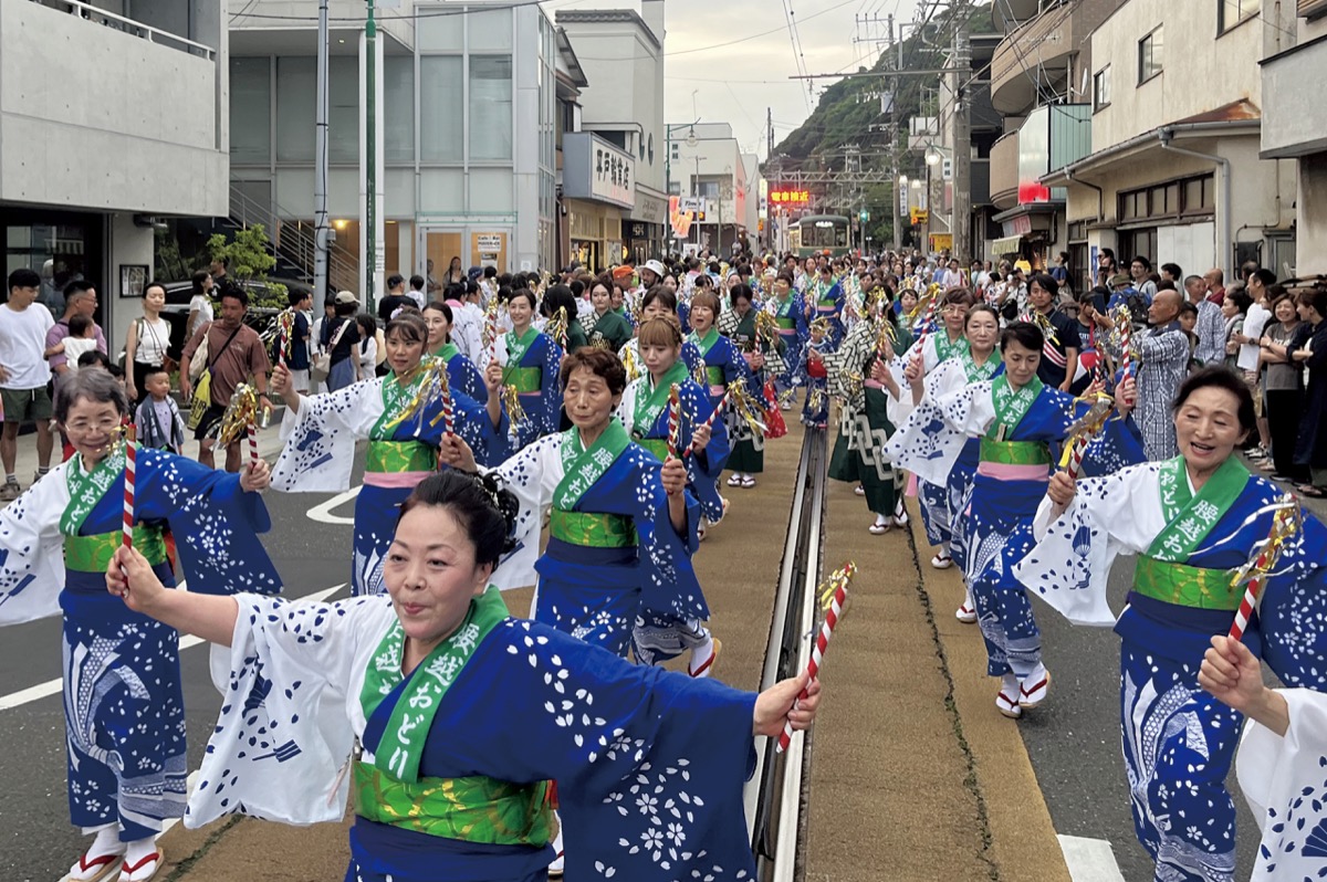 江ノ電が道路上を走る中で行われる腰越独特の流し踊り。マツケンサンバが披露されると、「オレッ!」の掛け声に合わせて歓声があがり、会場が一体になった。福重由貴子さん(44)と妹の黒木雅子さん(40)は、踊り手として30年以上参加する。福重さんは、「囃子の音色や神輿の掛け声、町内の山車は、未来につなげていきたい腰越の風景」と話した。