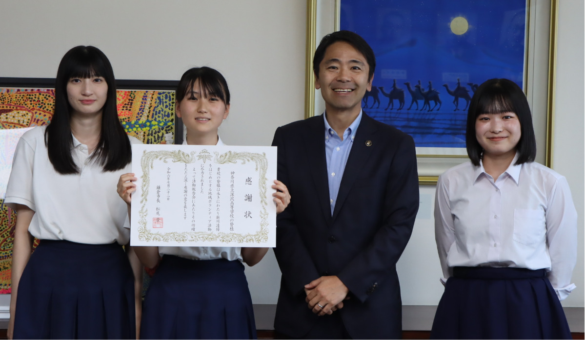鎌倉市は7月22日、長年にわたって地域ボランティア活動に取り組んできた深沢高校に、感謝状を贈呈した=写真。