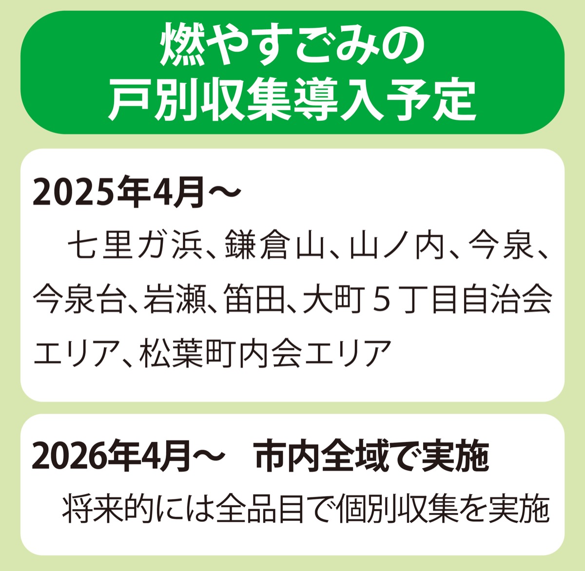 来年4月に先行して導入する地域は、七里ガ浜、鎌倉山、山ノ内、今泉、今泉台、岩瀬、笛田、大町5丁目自治会エリア、松葉町内会エリア。2026年4月からは、全市を対象に戸別収集を導入。最終的には、全品目での戸別収集の実施を目指している。