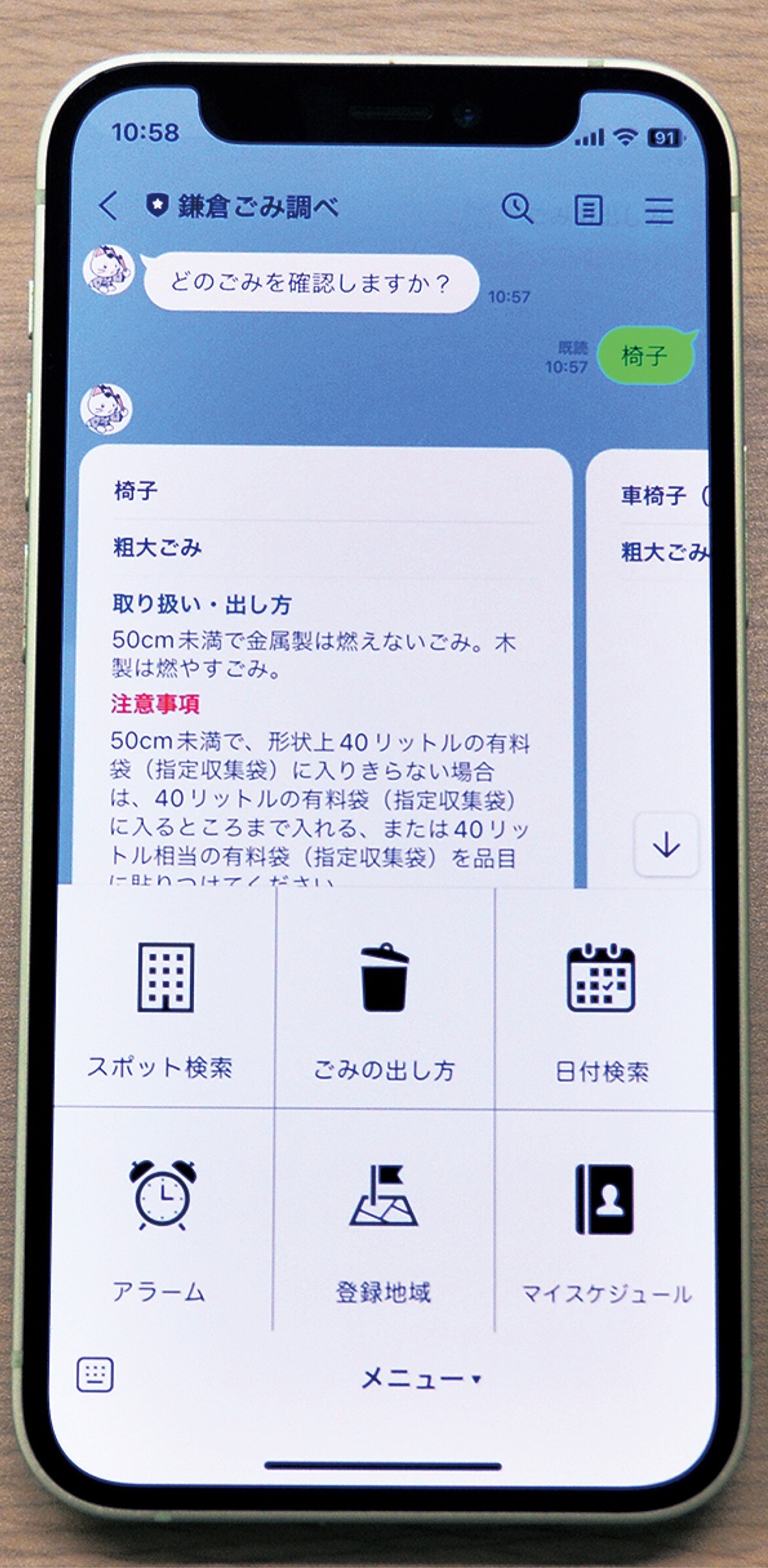 「複雑な分別を、利用者の多いLINEで」と企業からの提案事業として導入したサービスで、「椅子」「化粧品」のように出し方が分からないものを文字で送ると、分類や曜日、大きさや素材などの補足もまとめて回答する。頻繁に利用するという腰越の40代女性は「スマホケースとか、よく分からないものはとりあえず検索。ごみ調べがないと難しい」と話す。