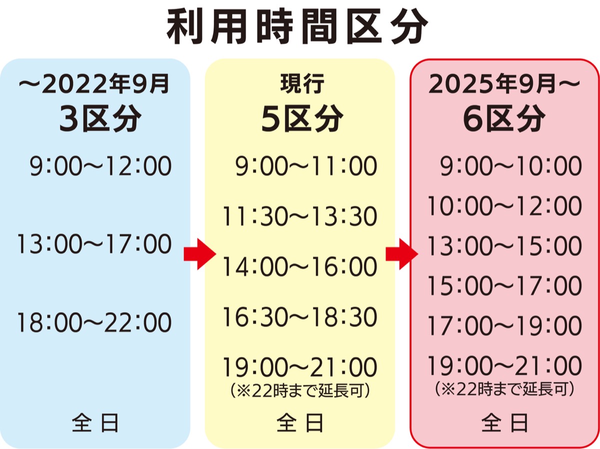 以前は1コマ3〜4時間の3区分だったが、施設運営を市から民間企業へと移す指定管理者制度導入のタイミングで、市が「より多くの市民が施設を使いやすくするため」と時間区分の変更に関する議案を市議会へ提出。一旦可決されたものの、「これまで通りがいい」という利用者の要望もあり時間区分を元に戻す案が議員から提出されて可決。これを受け、松尾崇市長が市議会の議決に異議がある場合にやり直しを求める「再議」を発動し、最終的には市が最初に提出した5区分案で決着した。ただし22年10月からの区分変更後、利用者の声を聞き「必要なら再び区分を見直すこと」が付されていた。