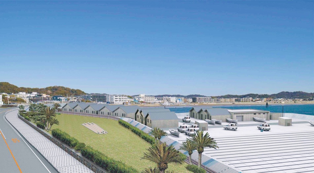 鎌倉市が坂ノ下に建設を予定する漁港の、完成予想図ができあがった。漁具倉庫や船揚場などを整える一方で、規模は最小限に留める「漁業支援施設」。建設に向けた基本設計や海の土質調査、測量業務が完了したことから、市は完成予想図を作成。10月下旬から、近隣住民らへ説明を進めている。