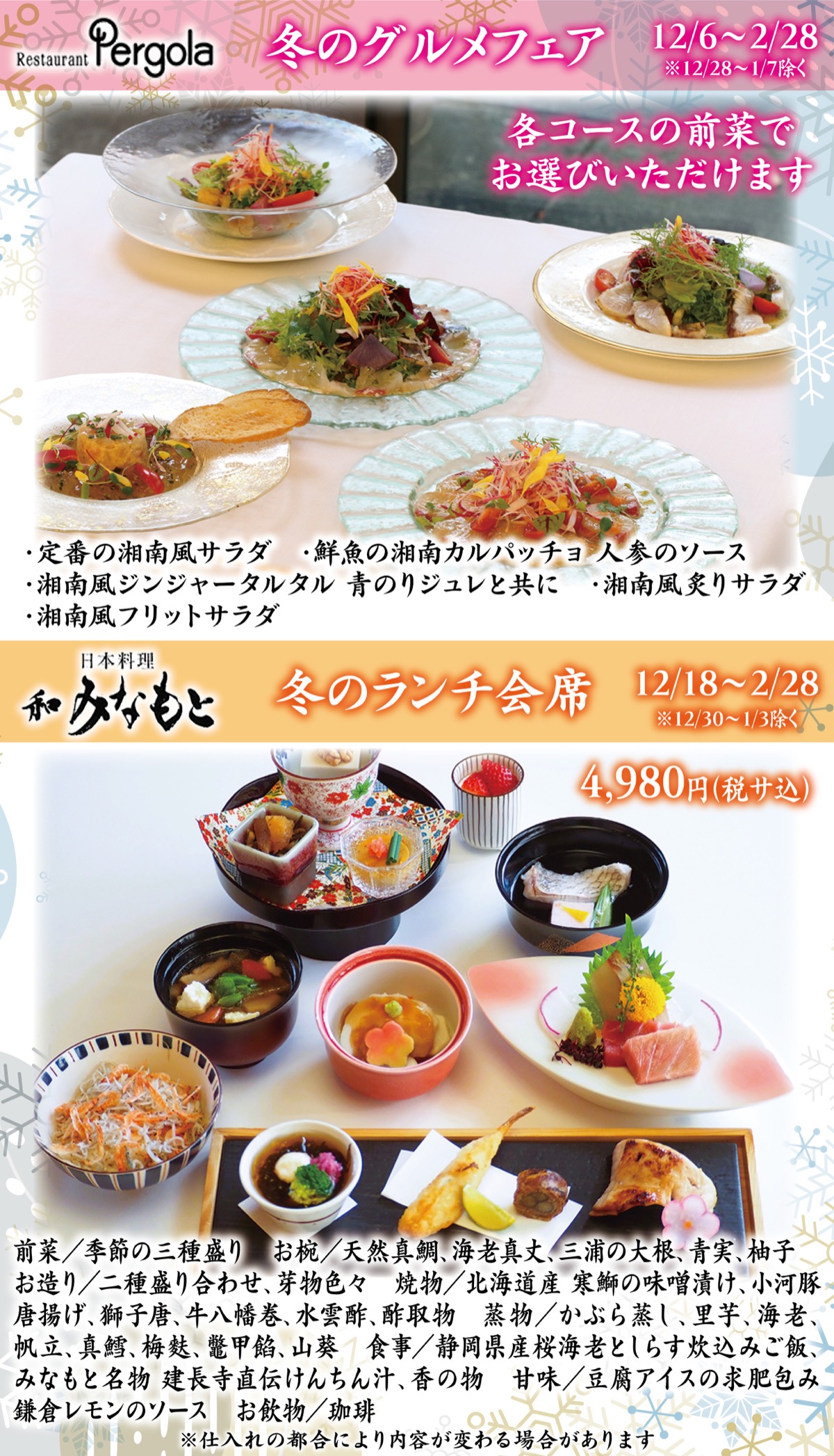 問い合わせは、和みなもと【電話】0467・25・5126、ペルゴーラ【電話】0467・25・5125へ。午前11時半〜午後2時(L.O.)。別にお祝い会席等もあり。