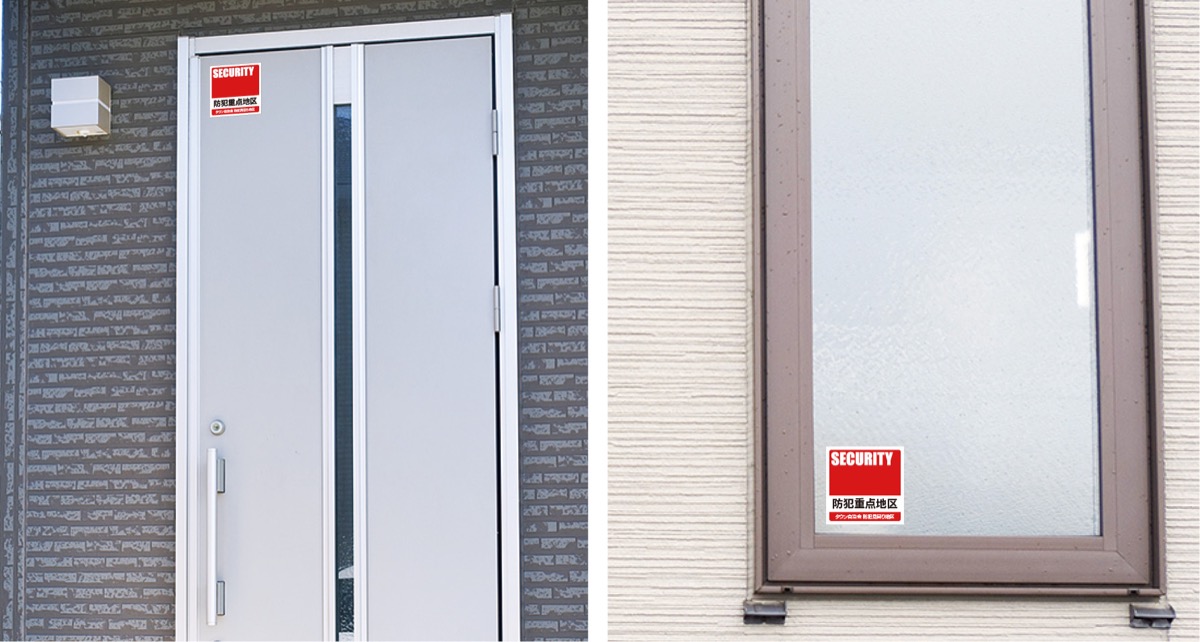 12cm×12cmサイズのステッカーには「防犯重点地区」などの警告文を、各団体の要望に合わせたオリジナルデザインで入れることが可能。ステッカーはUVラミネート加工のため、紫外線や雨に強く、耐久性が高いのも魅力の一つで、自宅や建物のドア、窓など場所を問わず貼りつけることができる。