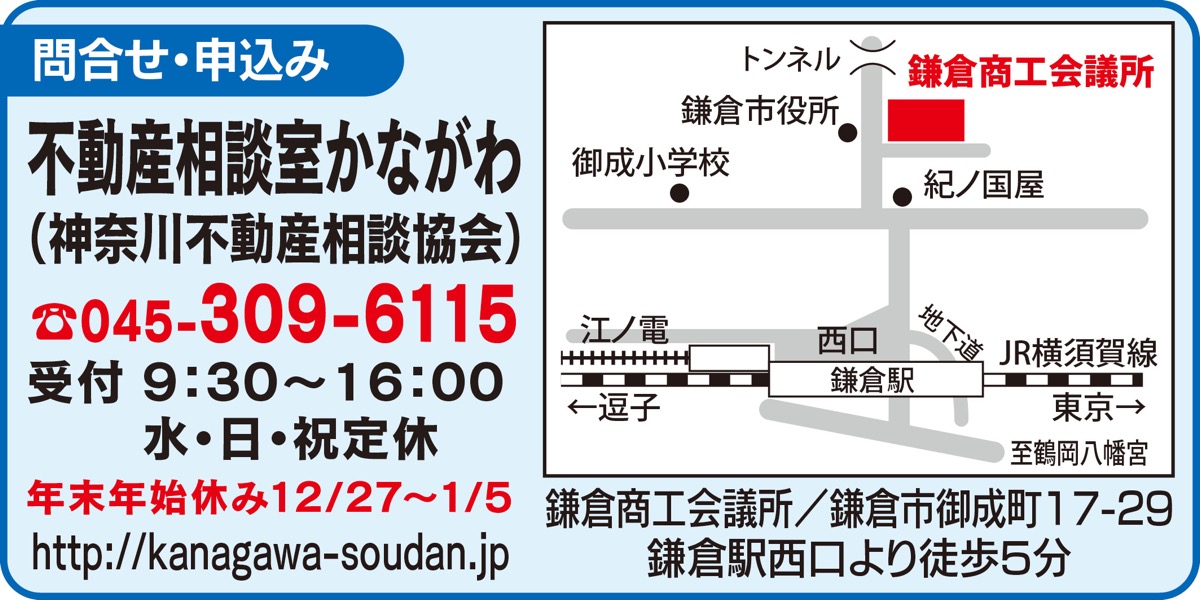 「不動産相談室かながわ」は毎月各地で相続と不動産に関する無料相談会を開催している。来年1月18日(土)は、鎌倉商工会議所102号室(鎌倉駅西口徒歩5分/御成町17の29)で開かれる。