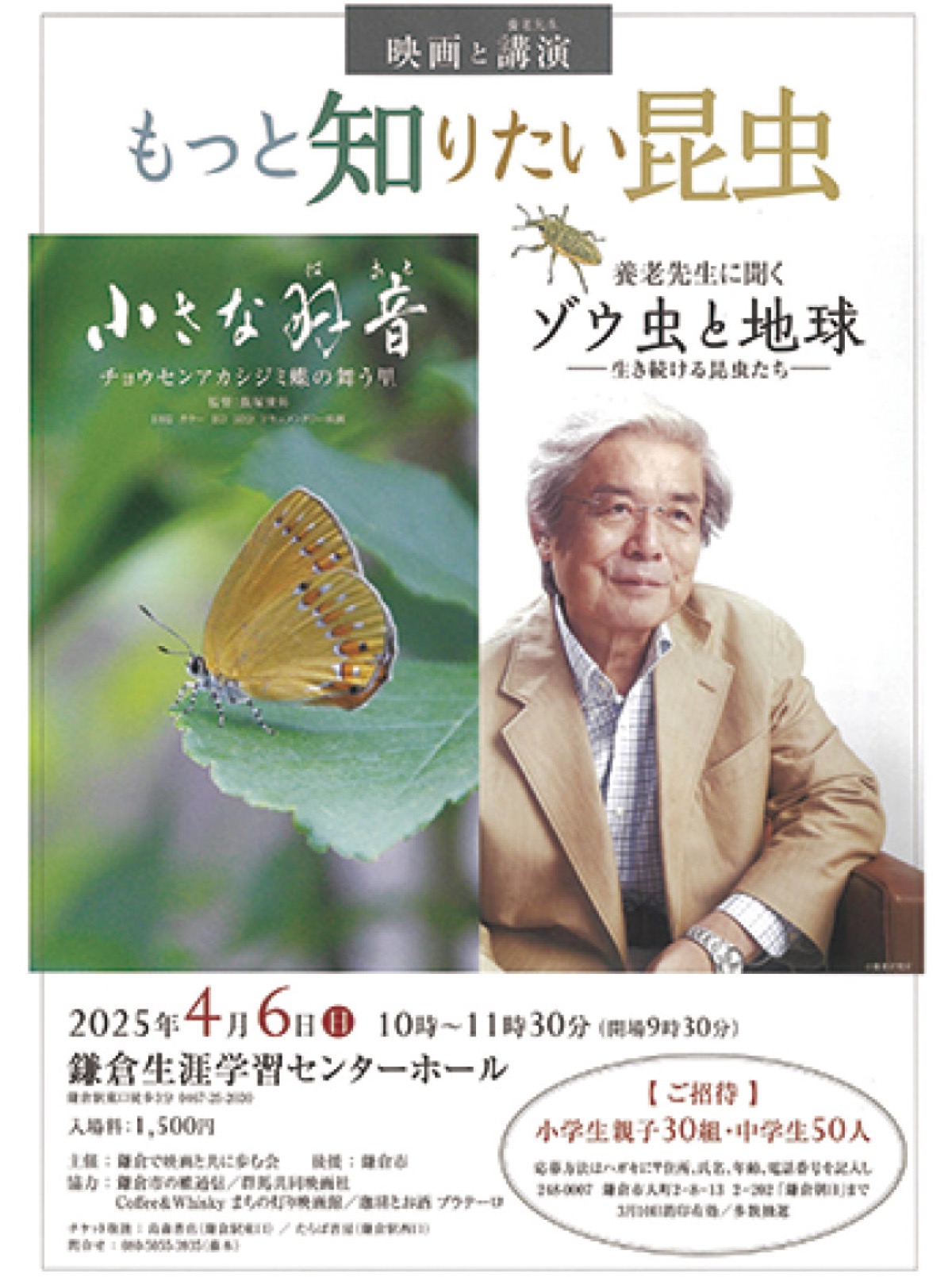 ドキュメンタリー『小さな羽音〜チョウセンアカシジミ蝶の舞う里〜』を上映し、鎌倉在住で東京大学名誉教授の養老さんが「ゾウ虫と地球〜生き続ける昆虫たち〜」について語る。午前10時〜11時半。入場料1500円。チケットは島森書店など。(問)藤本さん【携帯電話】080・5055・3935