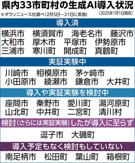 人工知能(AI)を用いて文章や画像を作成する生成AIが世界的に普及する中、業務に導入する自治体も増えてきている。神奈川県内33市町村のうち、導入済が12市町村で実証実験中を合わせ6割近い19市町村が生成AIを利用していることが、タウンニュース社の独自アンケート調査で明らかになった。