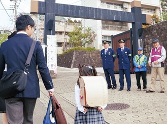 鎌倉市立小学校で入学式が行われた4月7日、大船警察署は新1年生に向けて交通安全を呼びかける見守り活動を管内各校前で実施した。