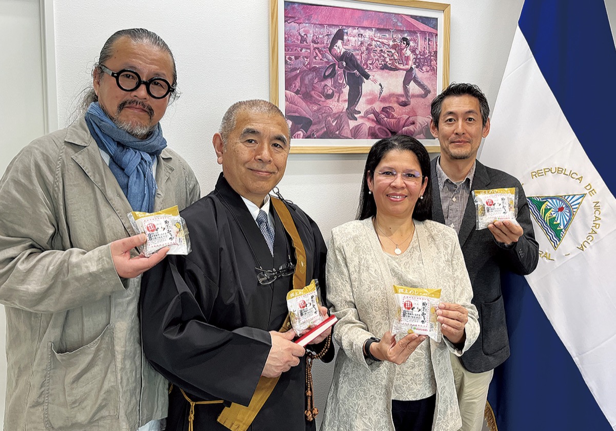 4月15日には、平井住職と澤渡さん、増山さんが駐日ニカラグア共和国大使館を訪問し、サンディ・アナベル・ダビラ・サンドバル駐日特命全権大使と会談。おむすびを試食した大使は、「おいしい」と笑顔に。その後、生産量の減少などニカラグアの厳しい現状などの話があり、そのような状況下で、御難おむすびが「大きな希望になる」と述べた。
