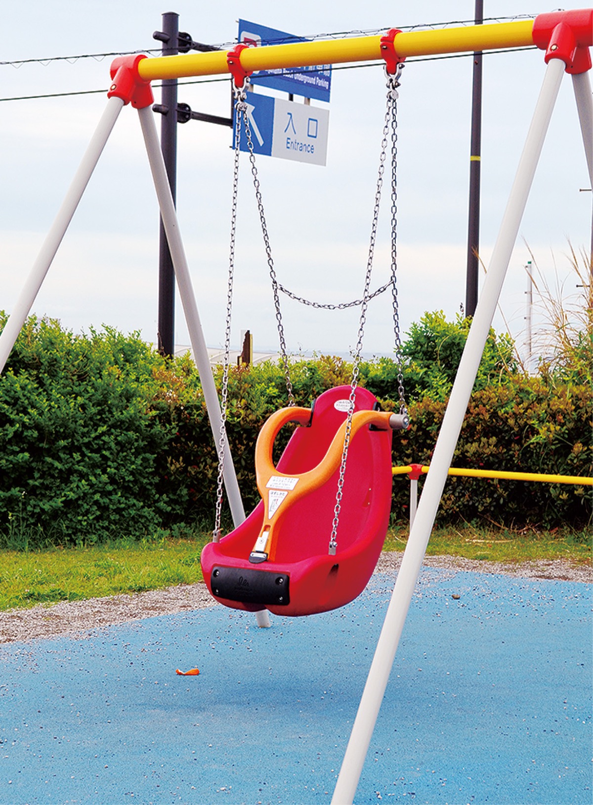 元々あった通常のブランコに加え、隣に設置されたのは、インクルーシブブランコ。体を包み込む形の座面でハーネスがついており、姿勢の保持が難しい子どもでも乗ることができる。さらに「ちびっこぞーん」として、乳幼児向けの遊具2つも追加された。
