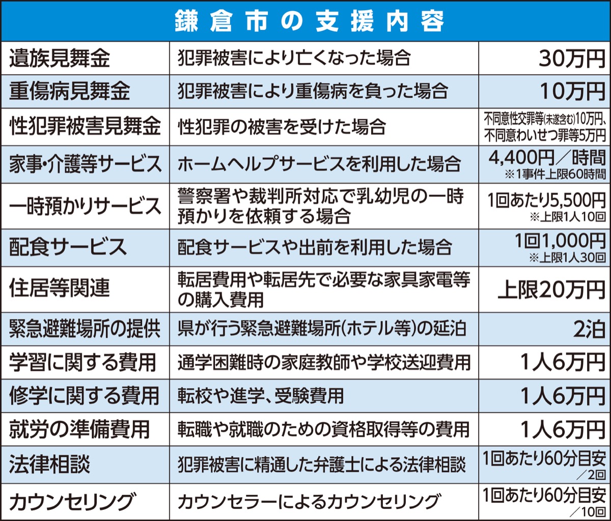 今年度から鎌倉市を含む神奈川県内7市で「犯罪被害者等支援条例」が施行された。鎌倉市では、今年4月1日以降の被害を対象に、本人や家族への見舞金のほか、生活支援サービスや住居関連の費用助成、カウンセリングなどを行っていく。県による支援と併せて受けられる。