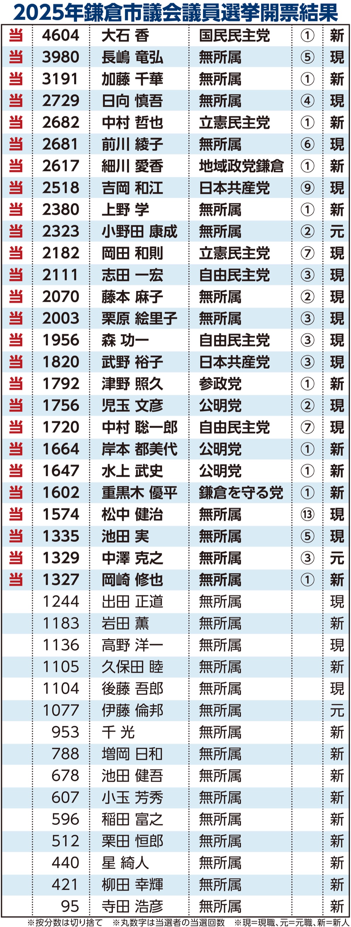 任期満了に伴う鎌倉市議会議員選挙が4月27日に投開票され、新議員26人の顔ぶれが決まった。トップ当選は国民民主党新人の大石香氏(52)。当日の有権者数は14万7351人(男性6万8597人、女性7万8754人)、投票率は2021年の前回を1・07ポイント下回る47・66%だった。4月30日には当選証書授与式が同市議会で行われ、一人一人が同証書を受け取った。
