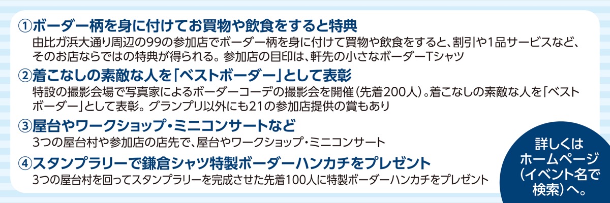 ボーダー柄をドレスコードにした「ボーダーフェスティバル」が今年も5月25日(日)に開催される。午前11時から午後4時。2014年に鎌倉市で誕生した同イベント。当日は、シャツやズボン、帽子など、何かしらのボーダー柄を身に付けて由比ガ浜大通り周辺で買い物や飲食をすると、さまざまな特典が受けられる。